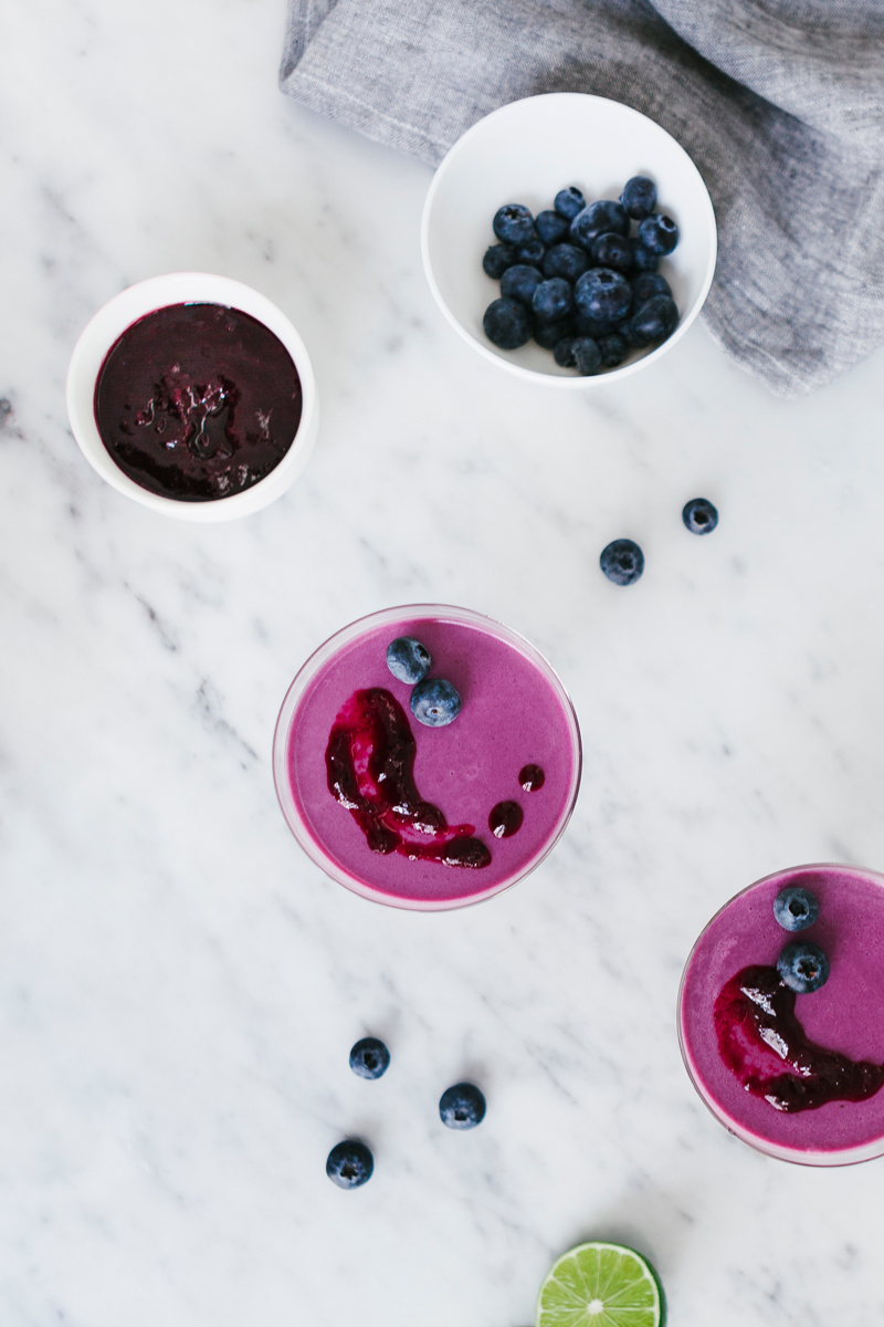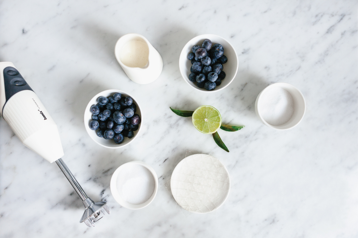 9 Doe de bosbessen, suiker en het limoensap in een steelpan. Mix de massa glad met je bamix staafmixer.