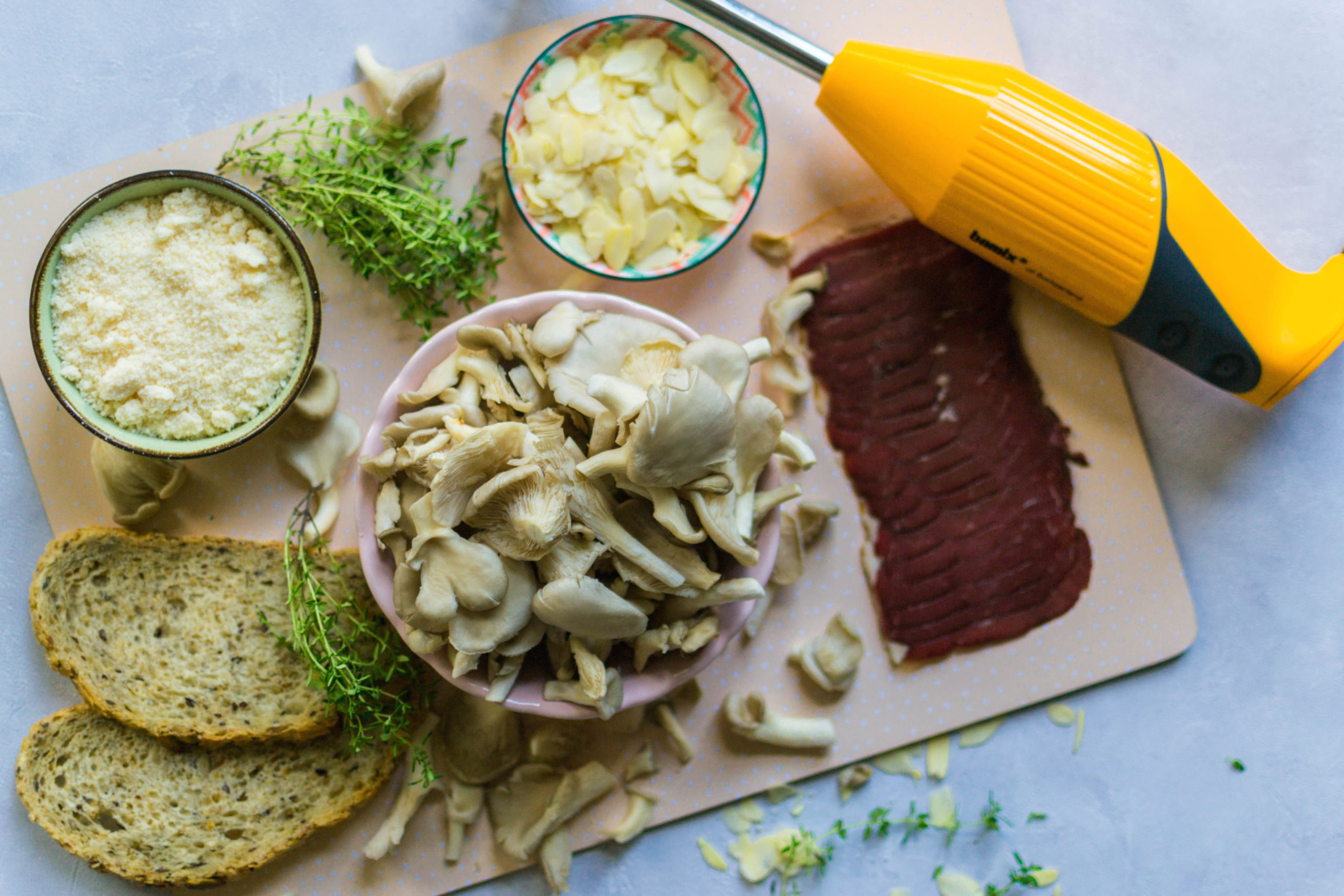 Crème van Grana Padano en oesterzwammen met look, amandel & tijm, toast met gerookte eendenborst.